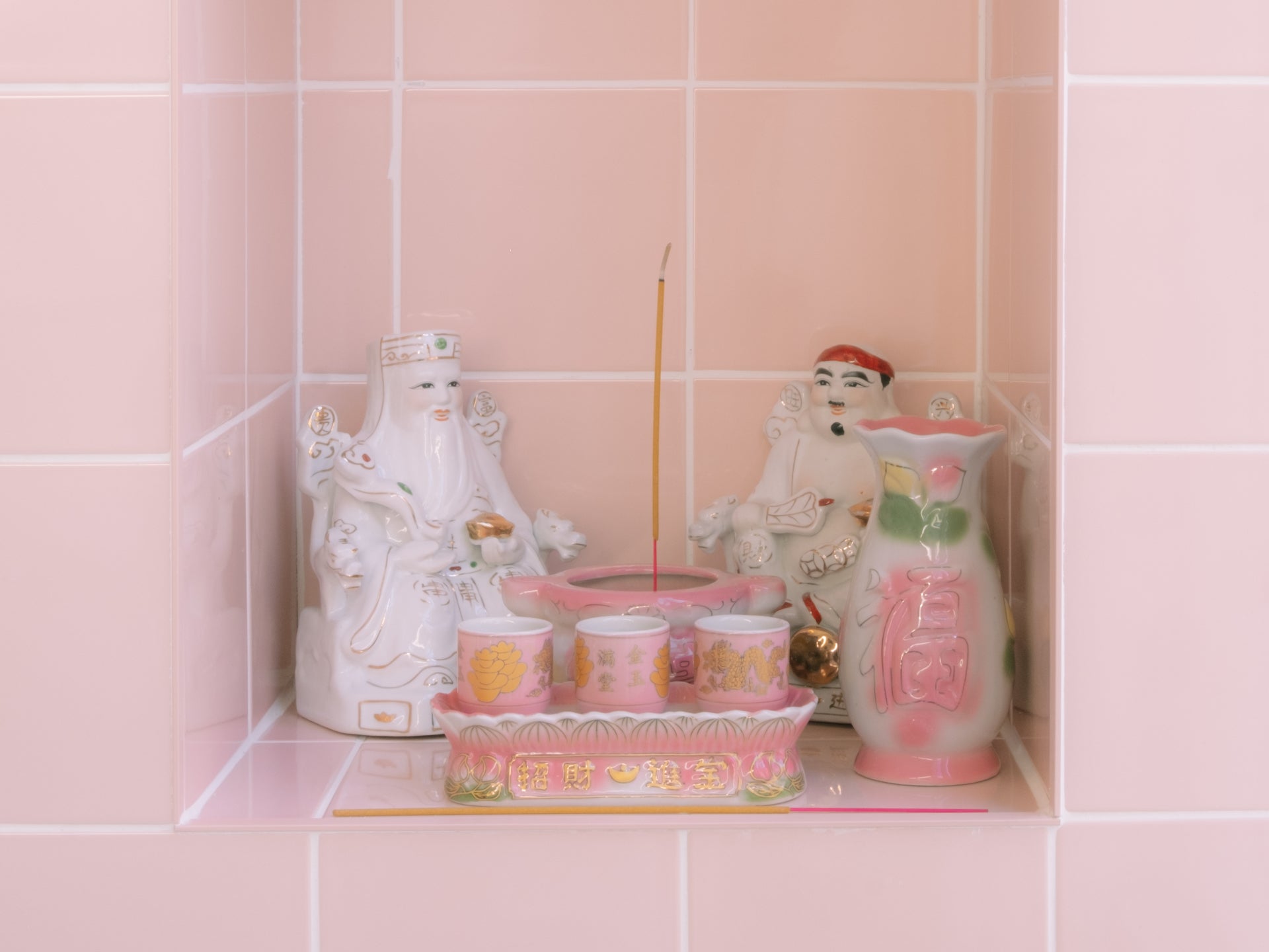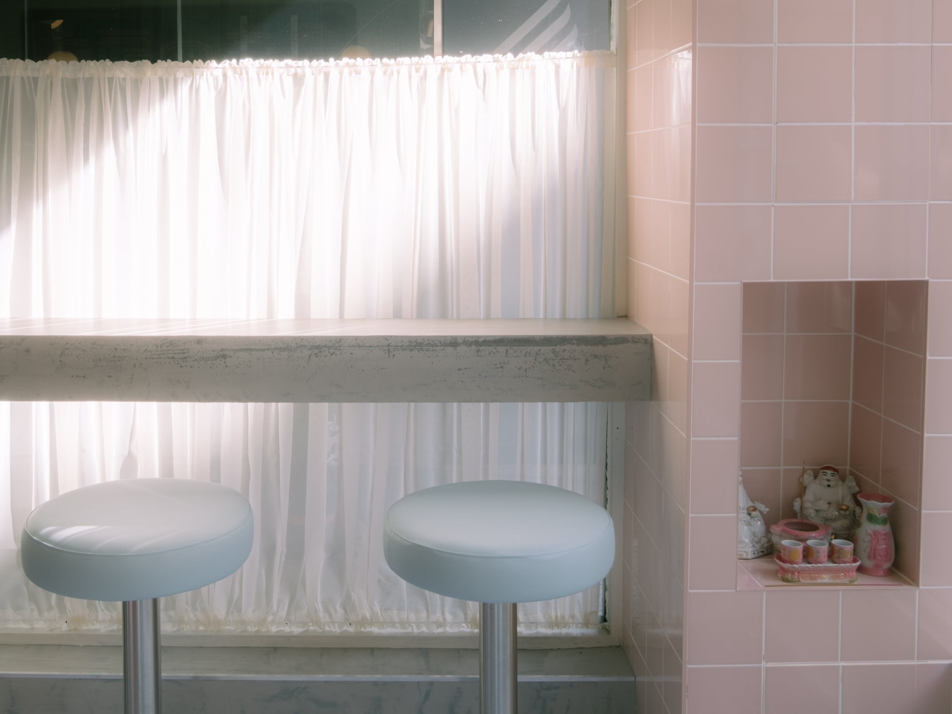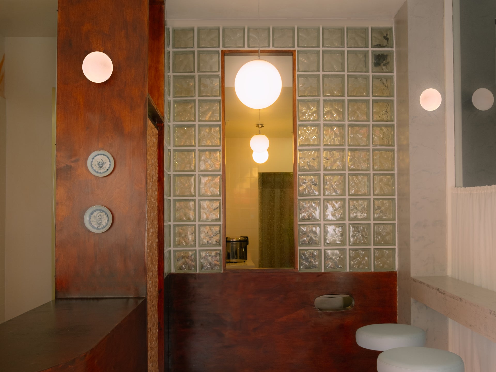 Designed by house of baby, Little Bánh Bánh provides a sense of calm amid the chaos of city life. Pairing a cool modernist palette of textured glass blocks, tiles and concrete with warm, natural touches of wood and lime plaster fresco, the space nods to material richness. The fresco and panels adorning the space are hand-painted by Tomio Shota, co-founder of house of baby, depicting soft, dreamlike compositions that nod to Vietnamese folk art, architecture and modernist paintings.