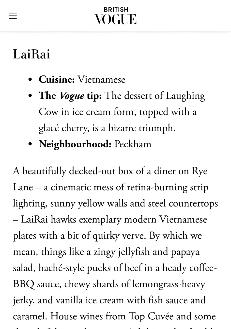 A beautifully decked-out box of a diner on Rye Lane – a cinematic mess of retina-burning strip lighting, sunny yellow walls and steel countertops – LaiRai hawks exemplary modern Vietnamese plates with a bit of quirky verve. By which we mean, things like a zingy jellyfish and papaya salad, haché-style pucks of beef in a heady coffee-BBQ sauce, chewy shards of lemongrass-heavy jerky, and vanilla ice cream with fish sauce and caramel. House wines from Top Cuvée and some thoughtful non-alc options (a hibiscus basil cold brew, for instance) complete the picture.
