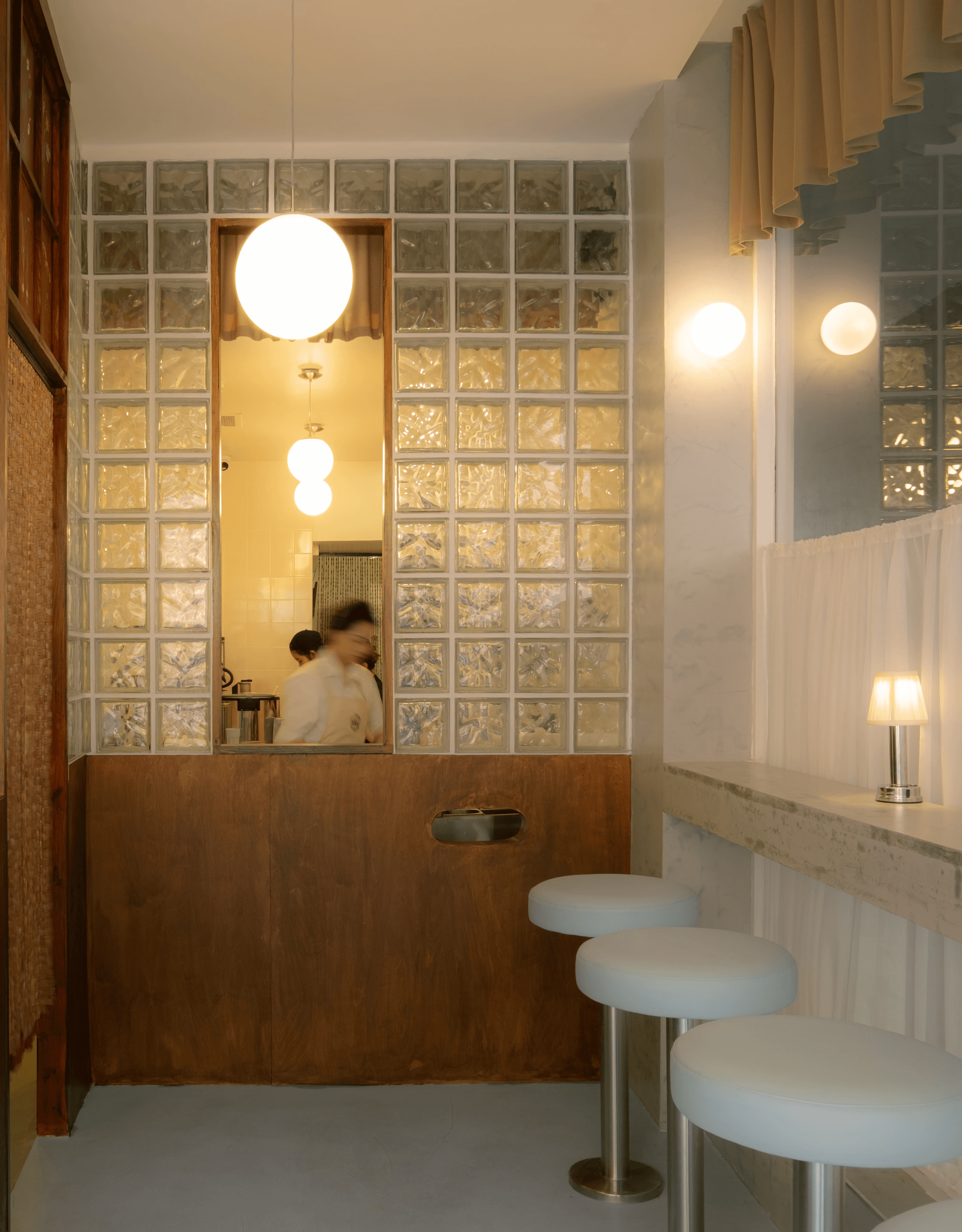 Little Bánh Bánh provides a sense of calm amid the chaos of city life. Pairing a cool modernist palette of textured glass blocks, tiles and concrete with warm, natural touches of wood and lime plaster fresco, the space nods to material richness. The fresco and panels adorning the space are hand-painted by Tomio Shota, co-founder of house of baby, depicting soft, dreamlike compositions that nod to Vietnamese folk art, architecture and modernist paintings.